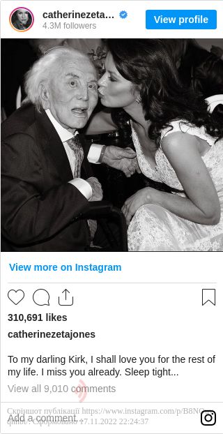 "Кірк, я буду любити тебе все життя. Я вже сумую за тобою", – пише в Instagram акторка Кетрін Зета – Джонс, дружина Майкла Дугласа.