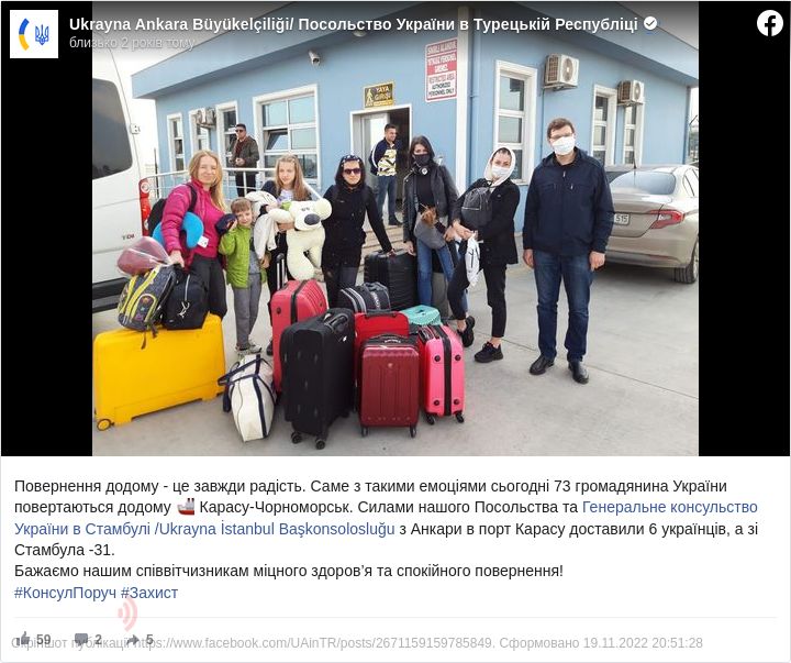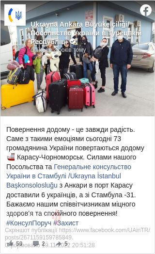 Як зазначається, Посольство та генконсульство у Стамбулі організували трансфер громадян до порту Карасу. Зокрема, забезпечили приїзд з Анкари шести українців, а зі Стамбула – 31.