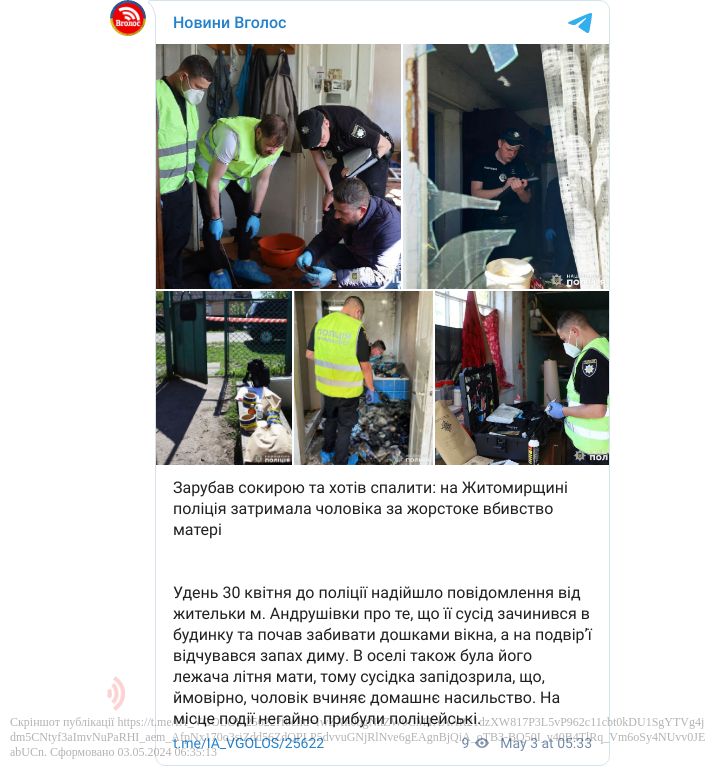 З місця події експерти вилучили ймовірне знаряддя вбивства та інші свідчення протиправного діяння.