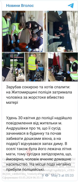 У будинку вони виявили понівечене тіло 83-річної жінки. Інші частини тіла криміналісти знайшли в печі – чоловік намагався їх спалити, ймовірно плануючи приховати злочин.