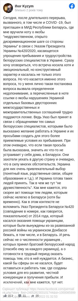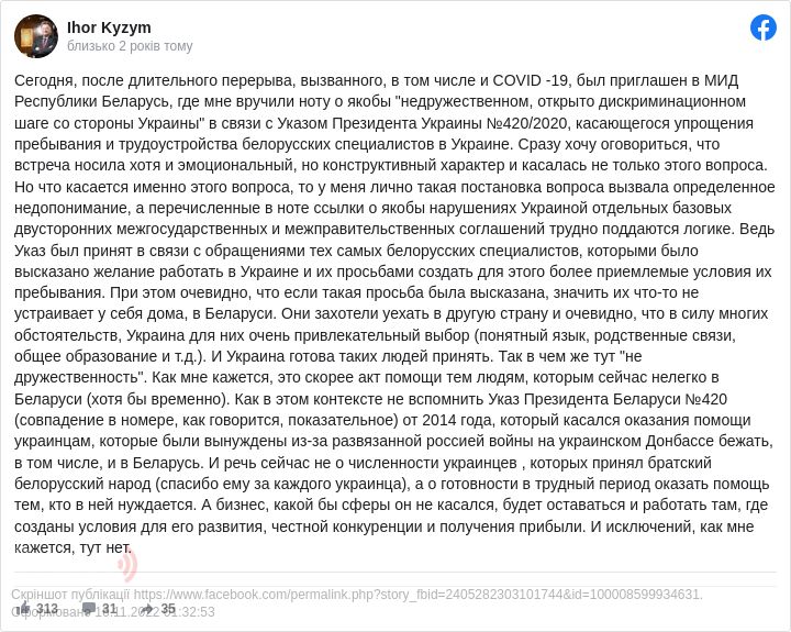 «Сьогодні, після тривалої перерви, викликаної, в тому числі і COVID -19, був запрошень в МЗС Республіки Білорусь, де мені вручили ноту щодо нібито »недружнього, відкрито дискримінаційного кроку з боку України« у зв'язку з указом президента України №420 / 2020 року, що стосується спрощення перебування і працевлаштування білоруських фахівців в Україні», - відзначив посол.