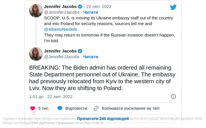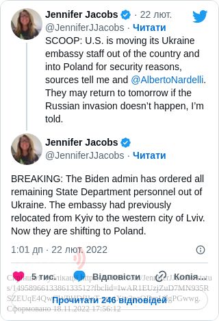 "Адміністрація Байдена наказала вивезти весь персонал Державного департаменту, що залишився, з України. Посольство раніше переїхало з Києва до західного міста Львова. Тепер вони переміщуються до Польщі", - повідомила вона.