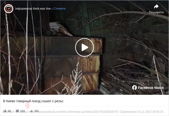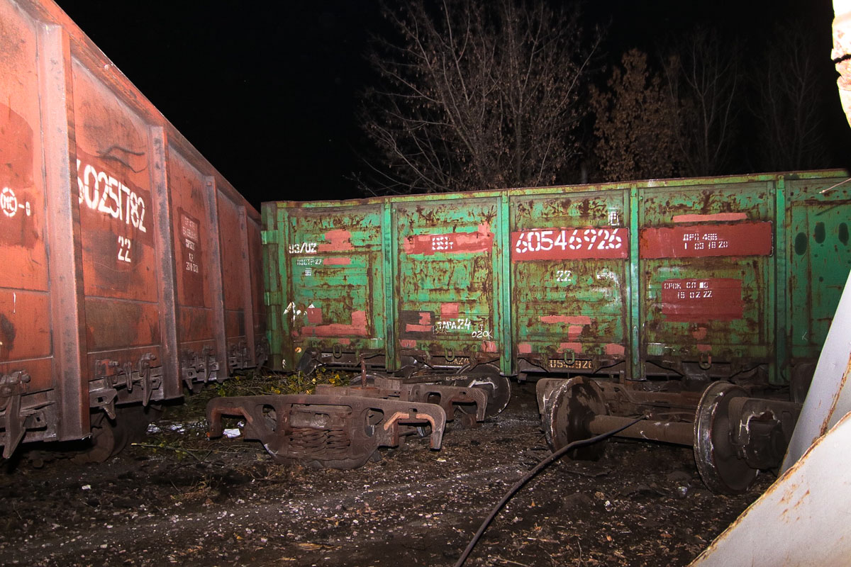 Товарний потяг зійшов із рейок по вул. Привокзальна, 21 і вилетів на автостоянку. Там він протаранив дві припарковані вантажівки.