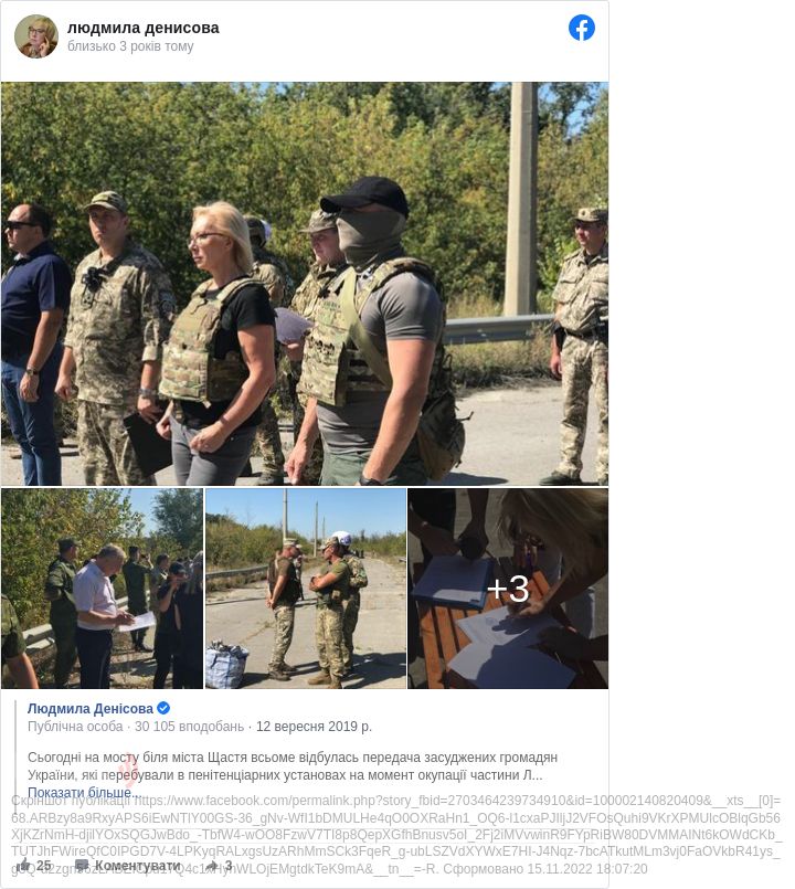 Ця передача ув'язнених громадян українській стороні була вже сьомою. Загалом із грудня 2018 року з непідконтрольної Києву частини Луганської області було передано 373 засуджених українців, а з Донецької – 13. З них 105 осіб було звільнено. За словами Денісової, робота з передачі утримуваних осіб триває.