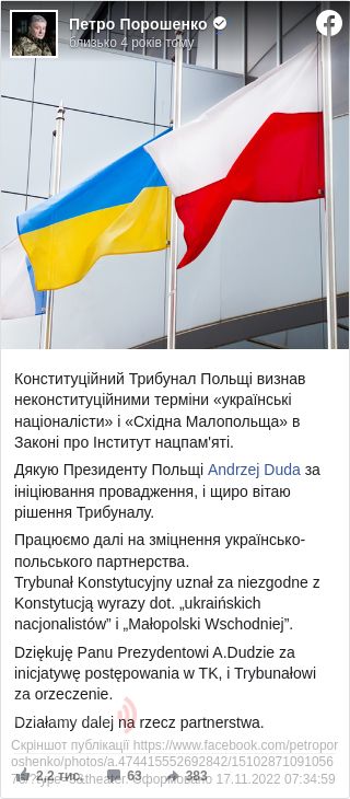 «Конституційний Трибунал Польщі визнав неконституційними терміни „українські націоналісти” і „Східна Малопольща” в Законі про Інститут нацпам'яті. Дякую Президенту Польщі Анджею Дуді за ініціювання провадження, і щиро вітаю рішення Трибуналу», - написав Порошенко на своїй сторінці у Facebook українською та польською мовами.