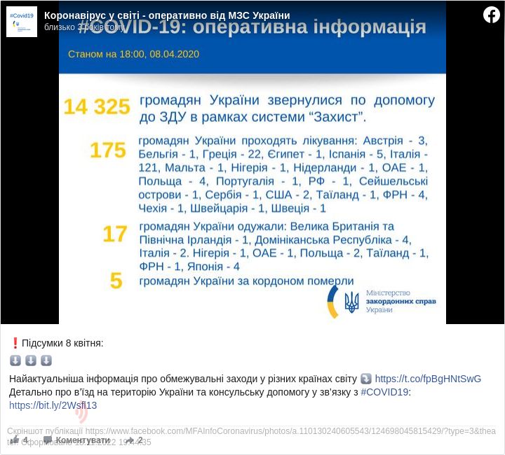 Про це повідомляється на сторінці «Коронавірус у світі – оперативно від МЗС України» у Facebook.