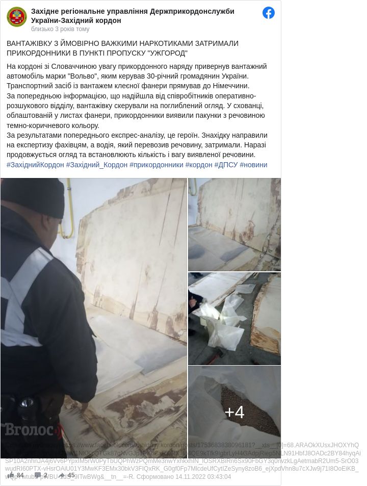 Наркотики були заховані у вантажівці, яка за документами везла фанеру в Німеччину. Фуру направили на ретельний огляд, під час якого в листах фанери знайшли схованку з пакетами темно-коричневої речовини. Експрес-аналіз показав, що це героїн.
