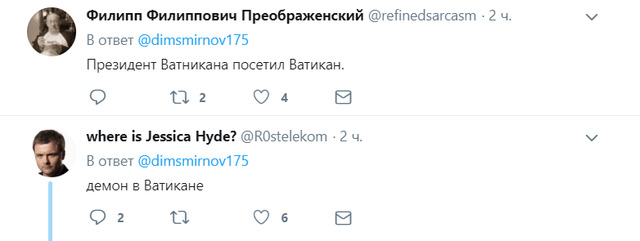 В коментарях писали: «На уклін?», «Гріхи відмолювати?», «Він ще виїзний?», «Упир прилетів», «Папа прилетів до Папи», Чи не погребує Пара Римський з Х**лом зустрічатися?«, »Так гріхи РПЦ не відпускає , поїхав до Папи на покаяння".