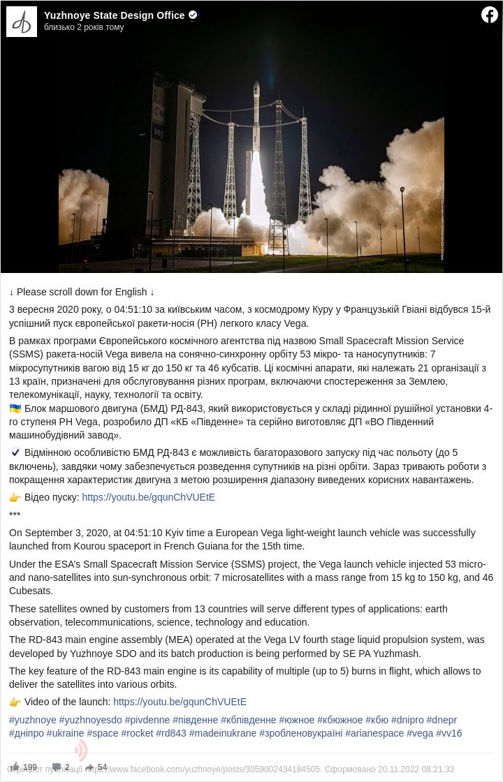 3 вересня 2020 року з космодрому Куру у Французькій Гвіані відбувся 15-й успішний пуск європейської ракети-носія легкого класу Vega. Блок маршового двигуна виготовило держпідприємство «ВО Південний машинобудівний завод».