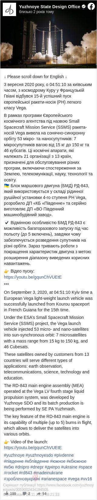 Зазначається, що блок маршового двигуна РД-843, який використовується у складі рідинної рушійної установки 4-го ступеня РН Vega, розробило ДП "КБ "Південне" та серійно виготовляє ДП "ВО Південний машинобудівний завод".