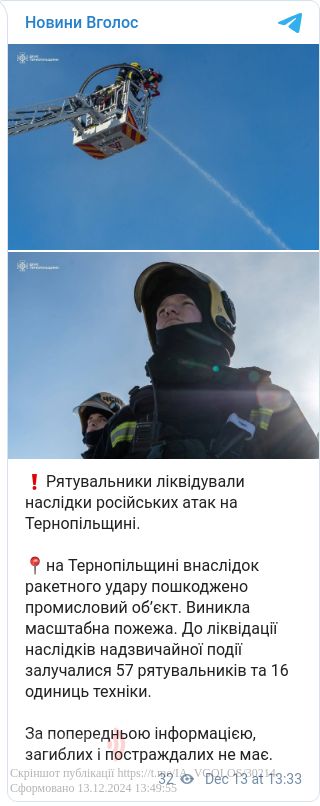 На Тернопільщині внаслідок ракетного удару пошкоджено промисловий об’єкт. Виникла масштабна пожежа. До ліквідації наслідків надзвичайної події залучалися 57 рятувальників та 16 одиниць техніки.