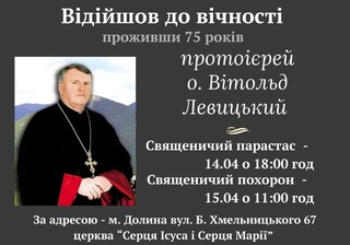 Скорботна звістка надійшла у Долинську громаду: у перший день Світлого тижня помер священник Української Греко-Католицької Церкви о. Вітольд Левицький.