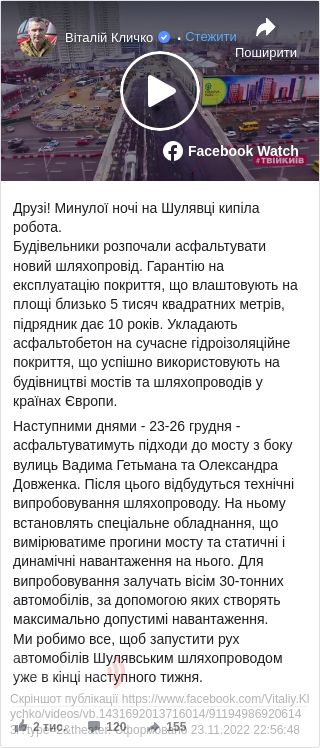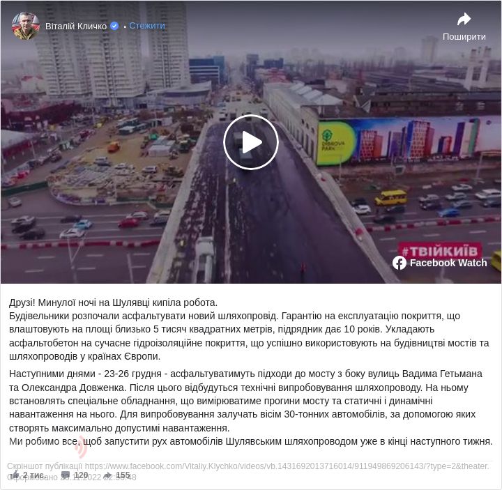 «Минулої ночі на Шулявці кипіла робота. Будівельники розпочали асфальтувати новий шляхопровід. Гарантію на експлуатацію покриття, яке облаштовують на площі (а це близько 5 тисяч квадратних метрів), підрядник дає близько 10 років. Укладають асфальтобетон на сучасне гідроізоляційне покриття, що успішно використовують на будівництві мостів та шляхопроводів у країнах Європи», – зазначив у дописі до відео мер Києва.