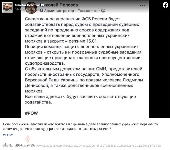 «Позиція команди захисту українських моряків — відкриті та прозорі судові засідання, які відповідають принципам розголосу під час здійснення правосуддя. З обов’язковим доступом на них ЗМІ, представників посольств іноземних держав, Уповноваженого Верховної Ради з прав людини Людмили Денисової, а також родичів військовополонених моряків», — заявив Полозов.