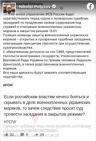 «ФСБ звернулася до суду з позапроцесуальним зверненням з вимогою провести засідання в закритому режимі щодо продовження запобіжного заходу (українським морякам. — Ред.), посилаючись при цьому на таємницю попереднього слідства», — написав він.