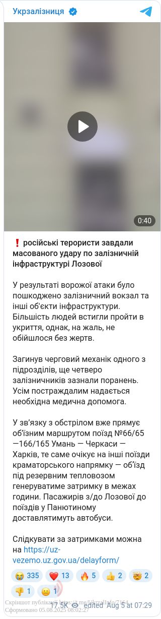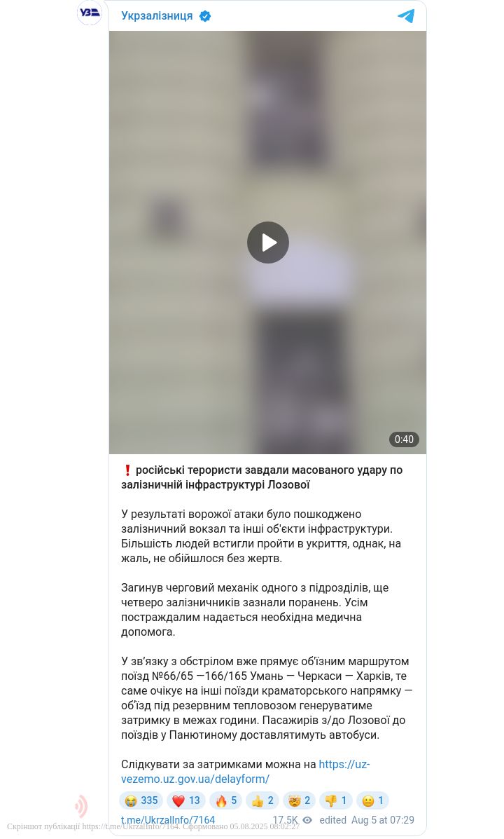 У ніч на вівторок, 5 серпня, російська армія завдала масованого удару по місту Лозова, що на Харківщині. Внаслідок удару пошкоджена залізнична інфраструктура. Відомо про одного загиблого та чотирьох поранених.