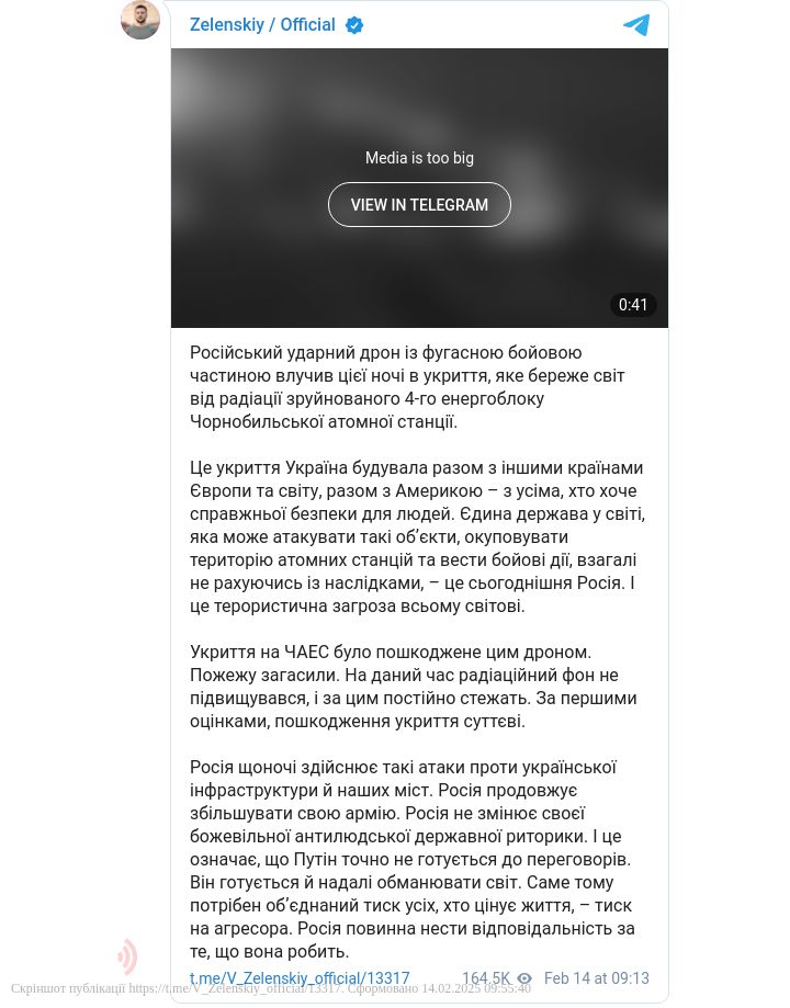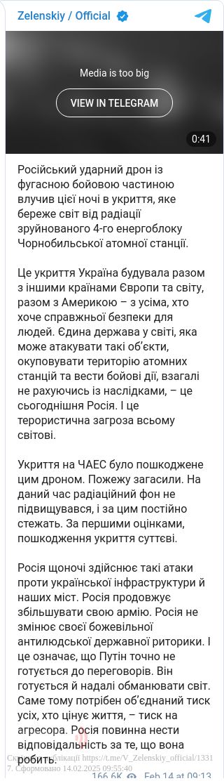"Російський ударний дрон із фугасною бойовою частиною влучив цієї ночі в укриття, яке береже світ від радіації зруйнованого 4-го енергоблоку Чорнобильської атомної станції. Це укриття Україна будувала разом з іншими країнами Європи та світу, разом з Америкою – з усіма, хто хоче справжньої безпеки для людей. Єдина держава у світі, яка може атакувати такі обʼєкти, окуповувати територію атомних станцій та вести бойові дії, взагалі не рахуючись із наслідками, – це сьогоднішня Росія. І це терористична загроза всьому світові", - написав Зеленський.