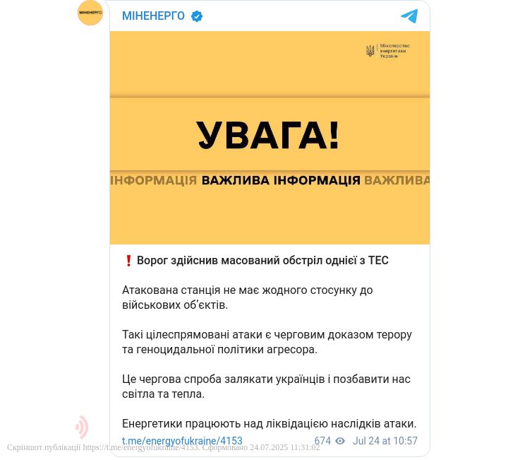 "Такі цілеспрямовані атаки є черговим доказом терору та геноцидальної політики агресора. Це чергова спроба залякати українців і позбавити нас світла та тепла, - йдеться у заяві.