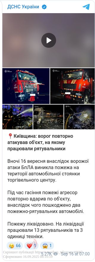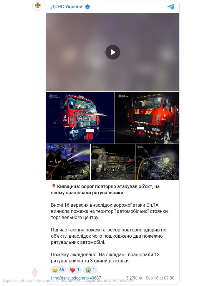 У ніч проти 16 вересня внаслідок атаки дронів-камікадзе на території автостоянки торгівельного центру виникла пожежа. Під час її гасіння агресор завдав повторного удару по об’єкту.