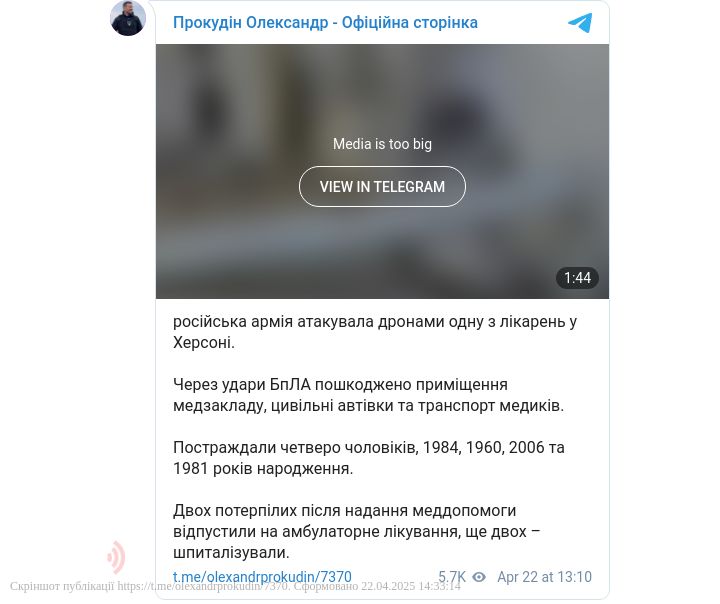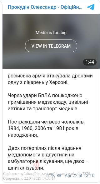 Окрім цього, через удари ворожих БПЛА пошкоджений один із херсонських медичних закладів, «швидкі» та цивільні авто.