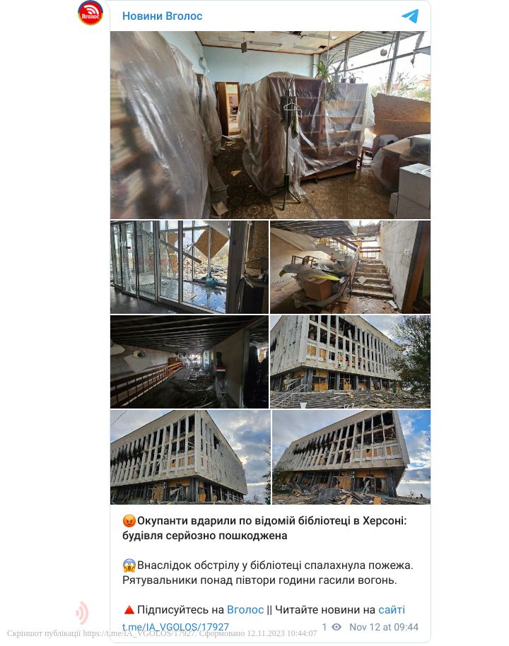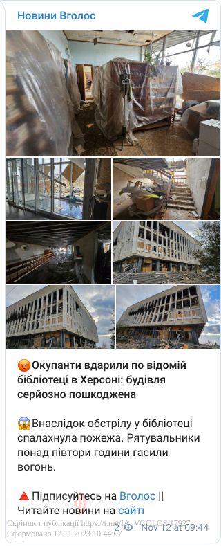 На опублікованих фото помітно, що будівля бібліотеки дуже пошкоджена, там вибиті вікна, зруйновані деякі конструкції.