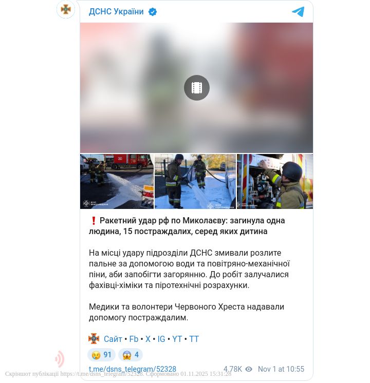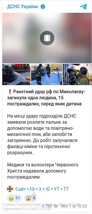 Вранці 1 листопада російські війська завдали ракетного удару по Миколаєву. За попередніми даними, загинула одна людина, ще 15 осіб, серед яких дитина, отримали поранення.