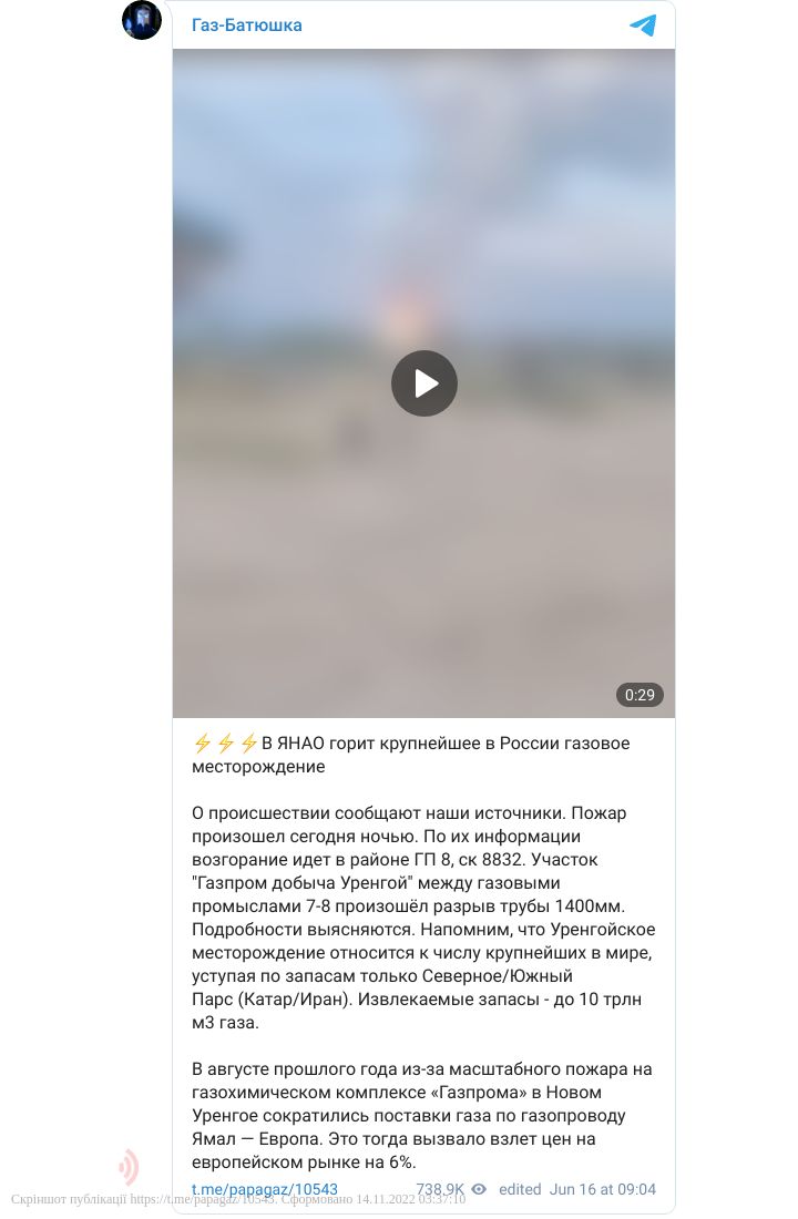 На росії вночі сталася пожежа через розрив труби на Уренгойському родовищі в Ямало-Ненецькому автономному окрузі.