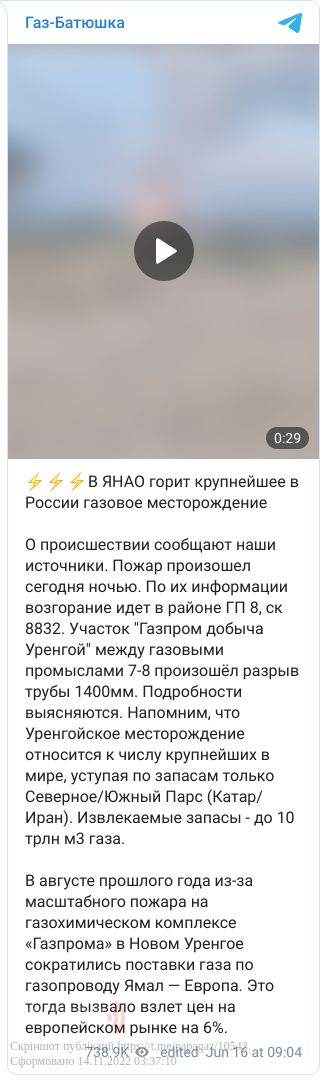 Зазначається, що на ділянці «Газпром видобуток Уренгой» між газовими промислами стався розрив труби 1400 мм, який спричинив пожежу.