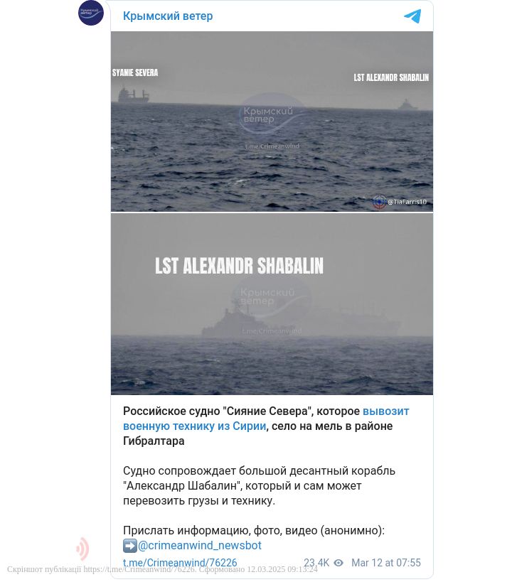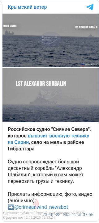 Російське судно «Сияние Севера», яке використовується для вивезення військової техніки із Сирії, сіло на мілину в районі Гібралтара.