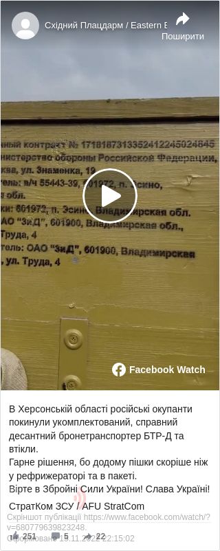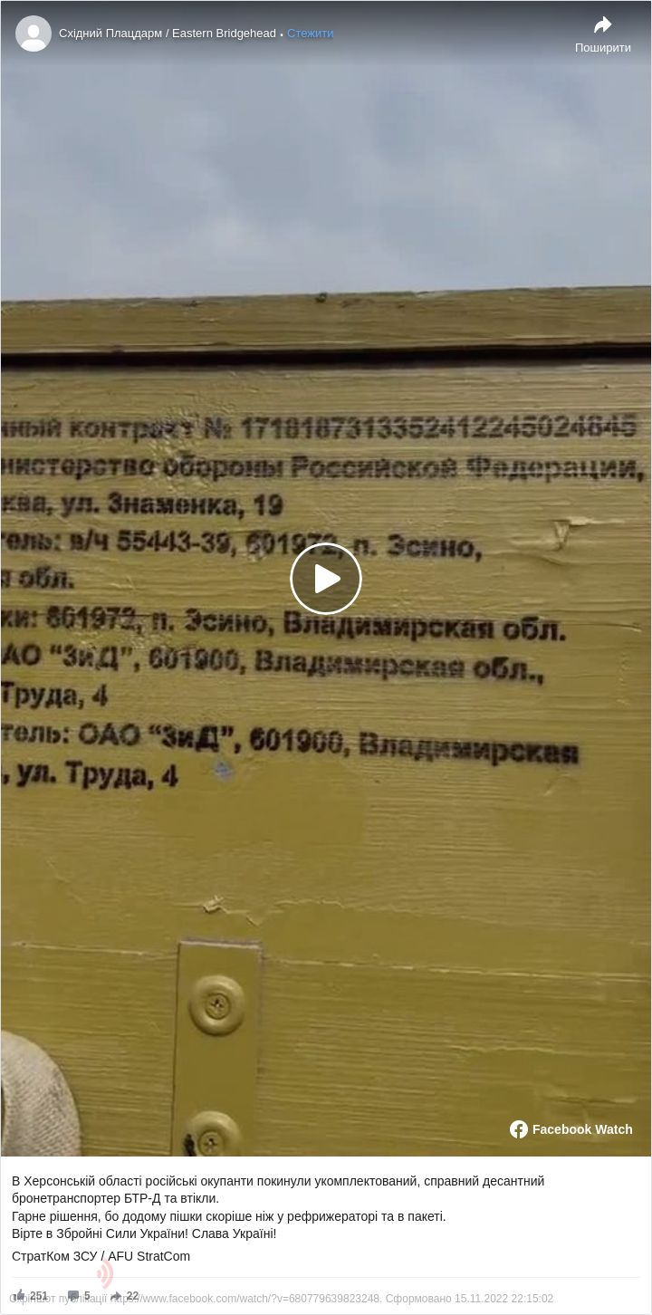 Захисники України виявили у Херсонській області десантний бронетранспортер БТР-Д. Трофейна техніка повністю укомплектована та справна.