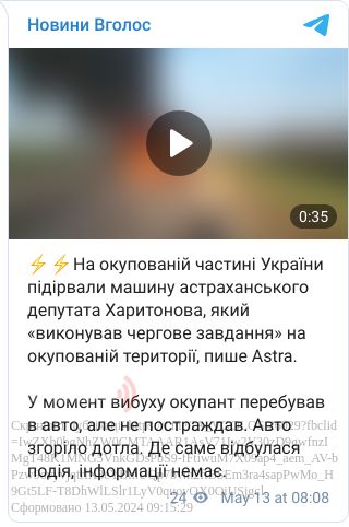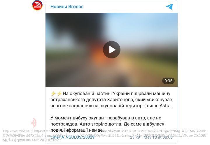На окупованій частині України підірвали машину астраханського депутата Харитонова, який «виконував чергове завдання» на окупованій території.