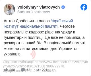Колишній глава Українського інституту національної пам'яті, депутат Володимир В'ятрович розкритикував свого наступника Антона Дробовича.