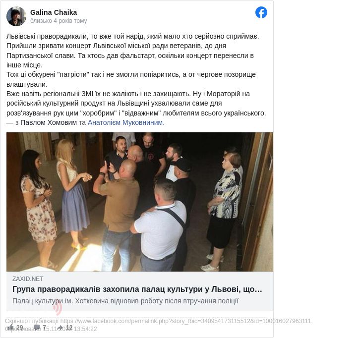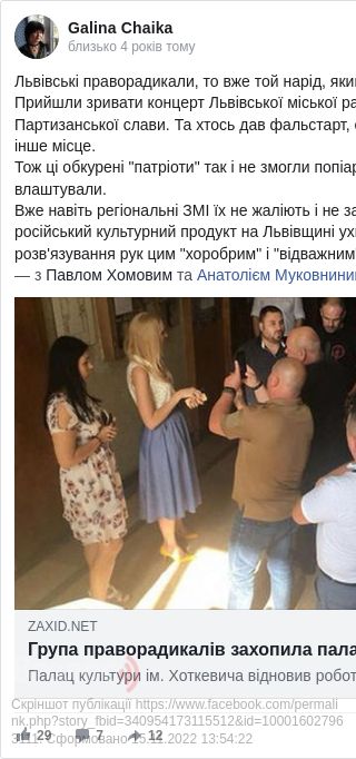“Львівські праворадикали, то вже той нарід, який мало хто серйозно сприймає. Прийшли зривати концерт Львівської міської ради ветеранів до дня Партизанської слави. Та хтось дав фальшстарт, оскільки концерт перенесли в інше місце”, - підписує Чайка перепост публікації Zaxid.net про “захоплення радикалами палацу Хоткевича”.