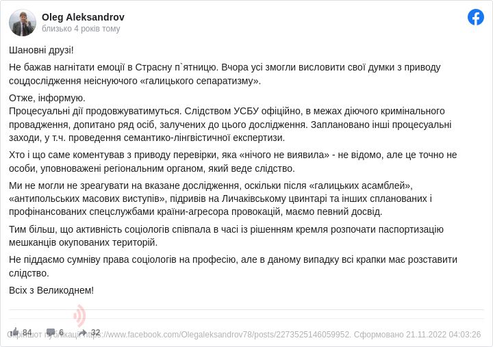 «Ми не могли не зреагувати на вказане дослідження, оскільки після «галицьких асамблей», «антипольських масових виступів», підривів на Личаківському цвинтарі та інших спланованих і профінансованих спецслужбами країни-агресора провокацій, маємо певний досвід. Тим більш, що активність соціологів співпала в часі із рішенням кремля розпочати паспортизацію мешканців окупованих територій. Не піддаємо сумніву права соціологів на професію, але в даному випадку всі крапки має розставити слідство», - додав Александров.