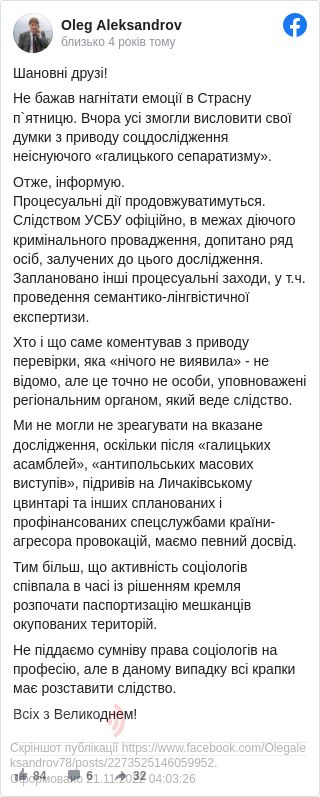«Процесуальні дії продовжуватимуться. Слідством УСБУ офіційно, в межах діючого кримінального провадження, допитано ряд осіб, залучених до цього дослідження. Заплановано інші процесуальні заходи, у т.ч. проведення семантико-лінгвістичної експертизи. Хто і що саме коментував з приводу перевірки, яка «нічого не виявила» - не відомо, але це точно не особи, уповноважені регіональним органом, який веде слідство», - написав Александров, пригадуючи заяву гендиректора Київського міжнародного інституту соціології Володимира Паніотто.