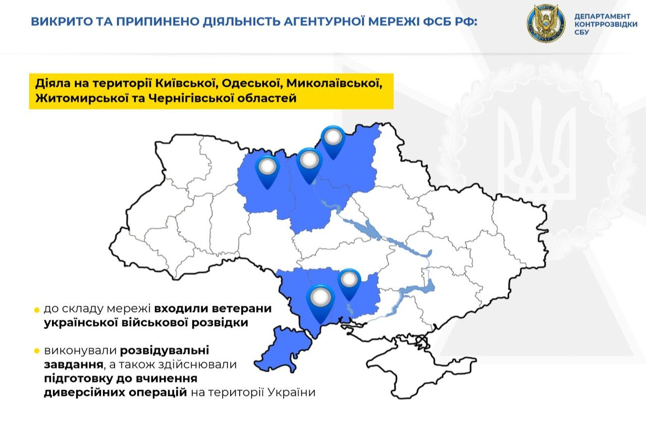 Повідомляється, що злочинці діяли в Київській, Одеській, Миколаївській, Житомирській та Чернігівській областях. Колишніх українських військових завербували кадрові працівники ФСБ Вадим Даутов та Денис Собко. Зрадники виконували виконували розвідувальні завдання на території цих областей.