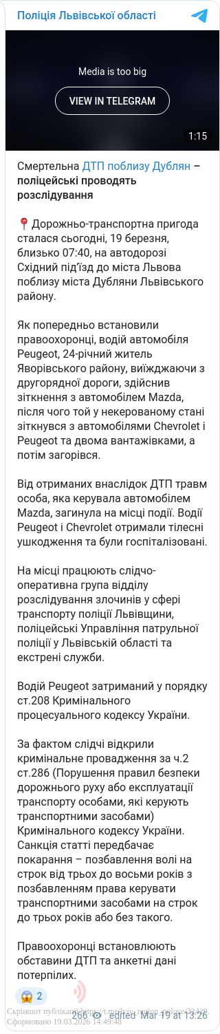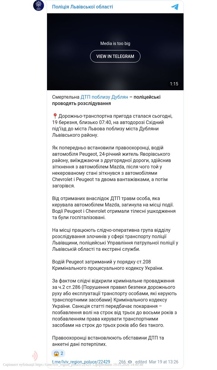 Трагедія трапилася сьогодні, 19 березня, близько 07:40 поблизу міста Дубляни. За попередніми даними правоохоронців: 24-річний житель Яворівського району за кермом Peugeot, виїжджаючи з другорядної дороги, врізався у Mazda. Після удару некерована Mazda протаранила ще два легковики (Chevrolet та Peugeot) і дві вантажівки, після чого машина загорілася.