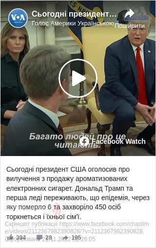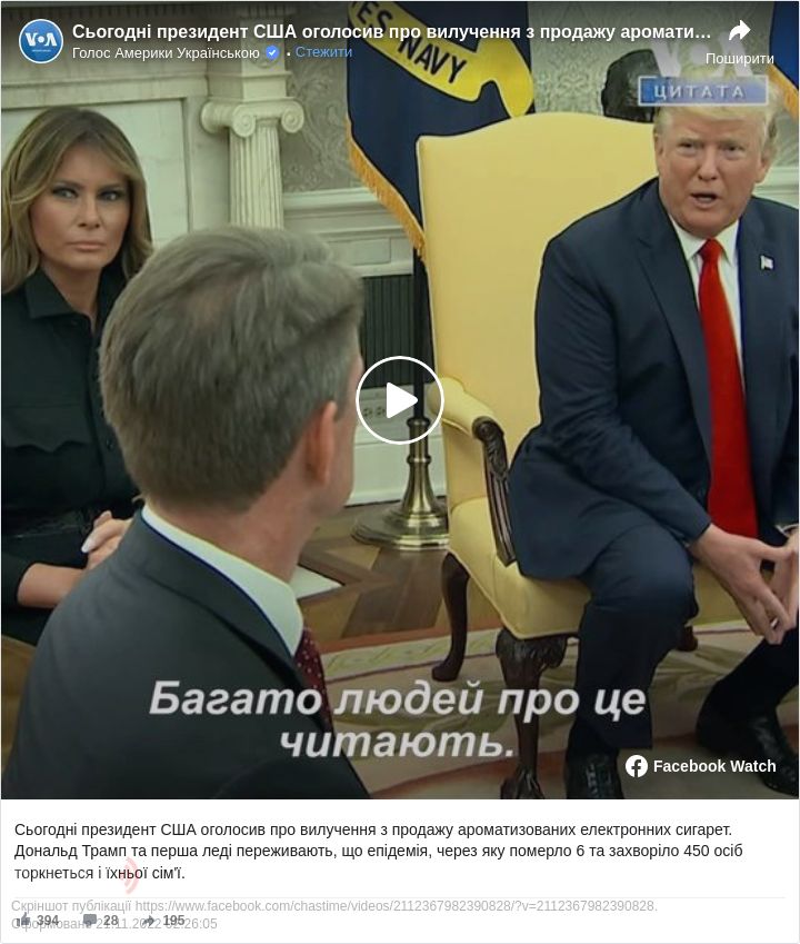 "Вейпінг став дуже великим бізнесом, наскільки я розумію, гігантським бізнесом за дуже короткий проміжок часу. Але ми не можемо дозволити людям хворіти, і ми не можемо підставляти молодь. І ми це чуємо. І тому перша леді за це взялася. У неї (нас) є син, чудовий юнак. І вона дуже за це переживає. Вона це бачить, ми обоє про це читаємо. Багато людей про це читають. І люди помирають через вейпи!", – зазначив Трамп.