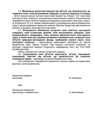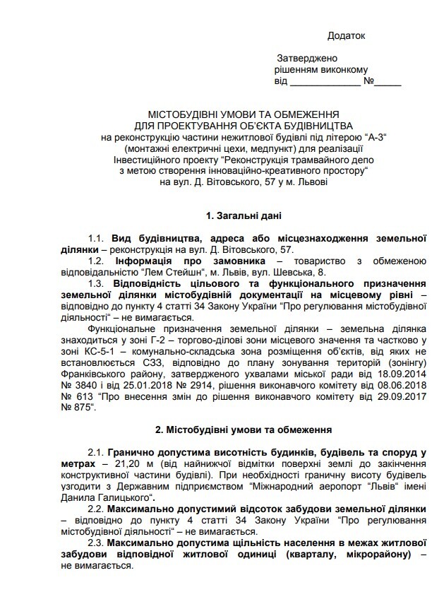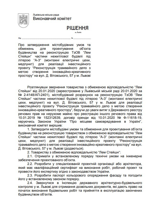 Так, найближчої п'ятниці, 31 січня, виконавчий комітет Львівської міськради під головуванням Садового розглядатиме рішення про реконструкцію ТзОВ «Лем Стейшн» частини нежитлової будівлі під літерою «А-3» для реалізації інвестиційного проекту «Реконструкція трамвайного депо з метою створення інноваційно-креативного простору» на вул. Д. Вітовського, 57 у м. Львові. Проект відповідного рішення вже опубліковано на сайті мерії.Клікайте для збільшення документу