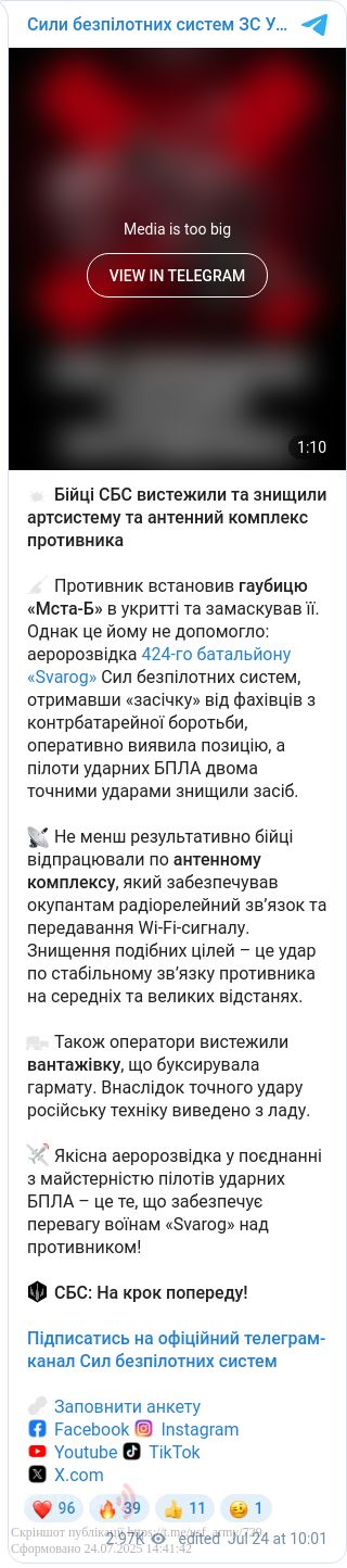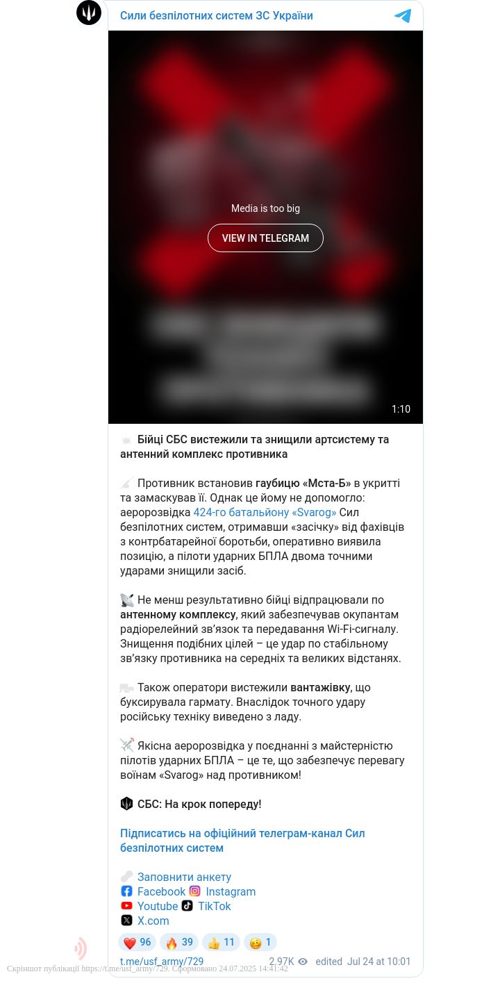 Зазначається, що операцію провели оператори 424-го батальйону «Svarog». Під час аеророзвідки бійці виявили замасковану гаубицю «Мста-Б».Її вдалося знищити двома точними ударами ударних дронів після наведення артилерії.