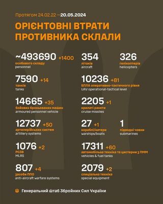 Загальні бойові втрати противника з 24.02.22 по 20.05.24 орієнтовно склали: