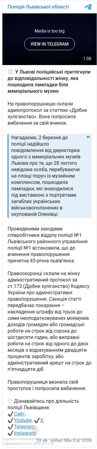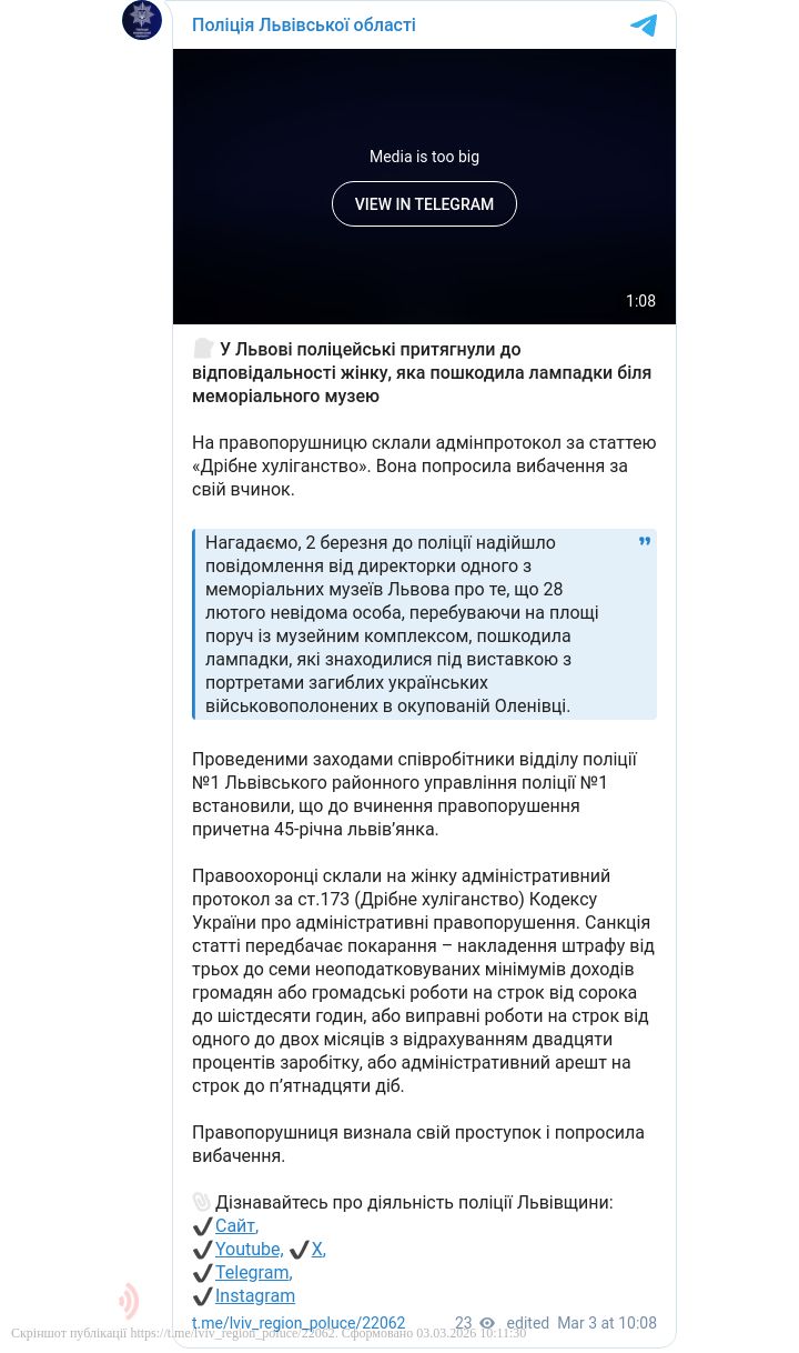 Подія трапилася ще 28 лютого на площі поруч із музейним комплексом. Невідома особа пошкодила пам’ятні лампадки під виставкою, присвяченою полеглим захисникам. Про цей факт правоохоронців поінформувала директорка музею, яка виявила наслідки дій зловмисниці.