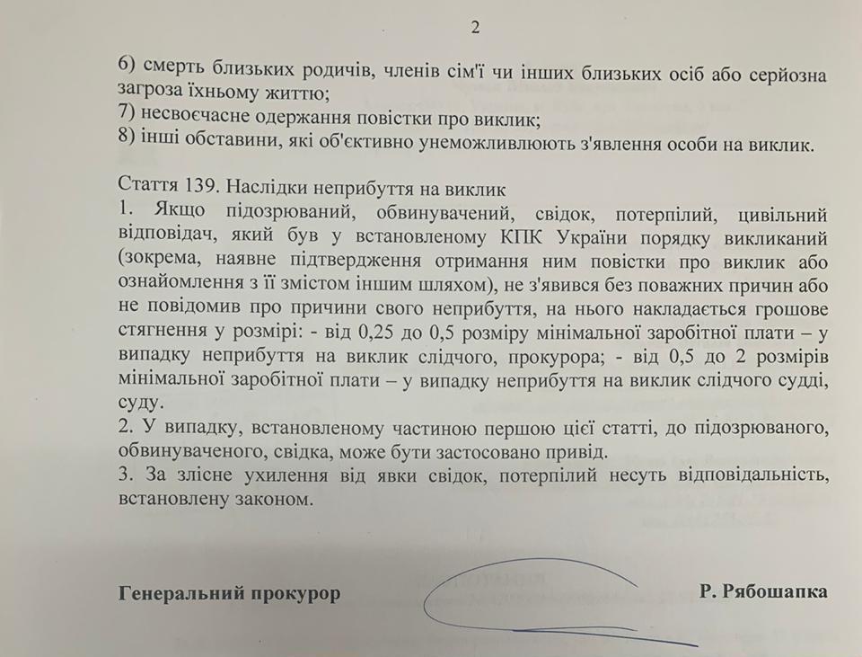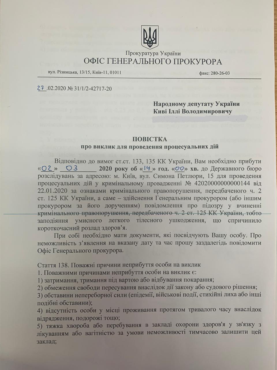 Зазначається, що Киву викликають на 14:00 2 березня.