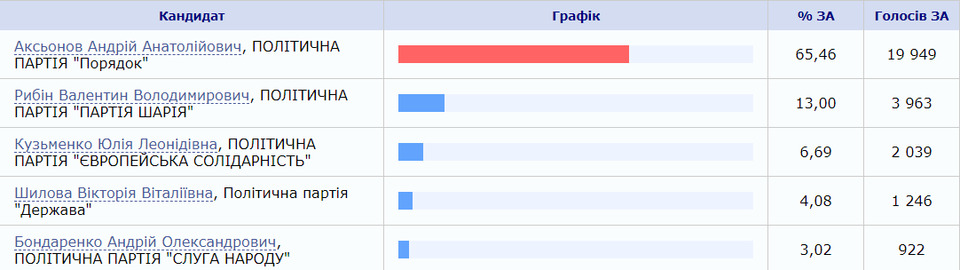 На другій позиції опинився представник «Партії Шарія» Володимир Рибін (13 % голосів), а представниця «Європейської солідарності» Юлія Кузьменко стала третьою (6,69 % голосів).