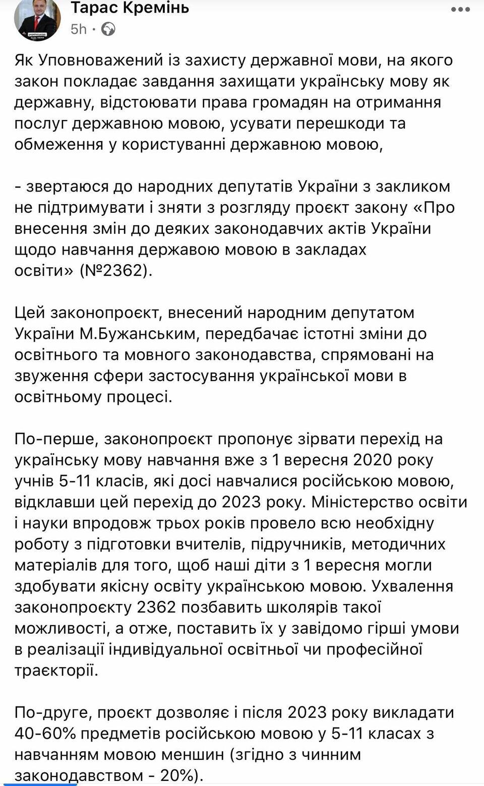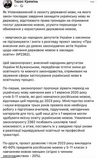 Йдеться про законопроєкт №2362, який передбачає скасування переходу учнів 5-11 класів російськомовних шкіл на українську мову навчання з 1 вересня 2020 року і відтермінування цього до 2023-го. Кремінь застеріг, що законопроєкт дозволяє і після 2023-го викладати 40-60% предметів мовою нацменшин, зокрема російською мовою (зараз – 20%), а також викладати «один або кілька предметів» російською.За його словами, твердження, що законопроєкт спрямований на захист порушених конституційних прав російської або інших нацменшин, не відповідають дійсності.