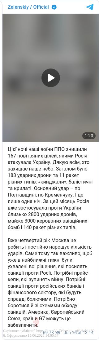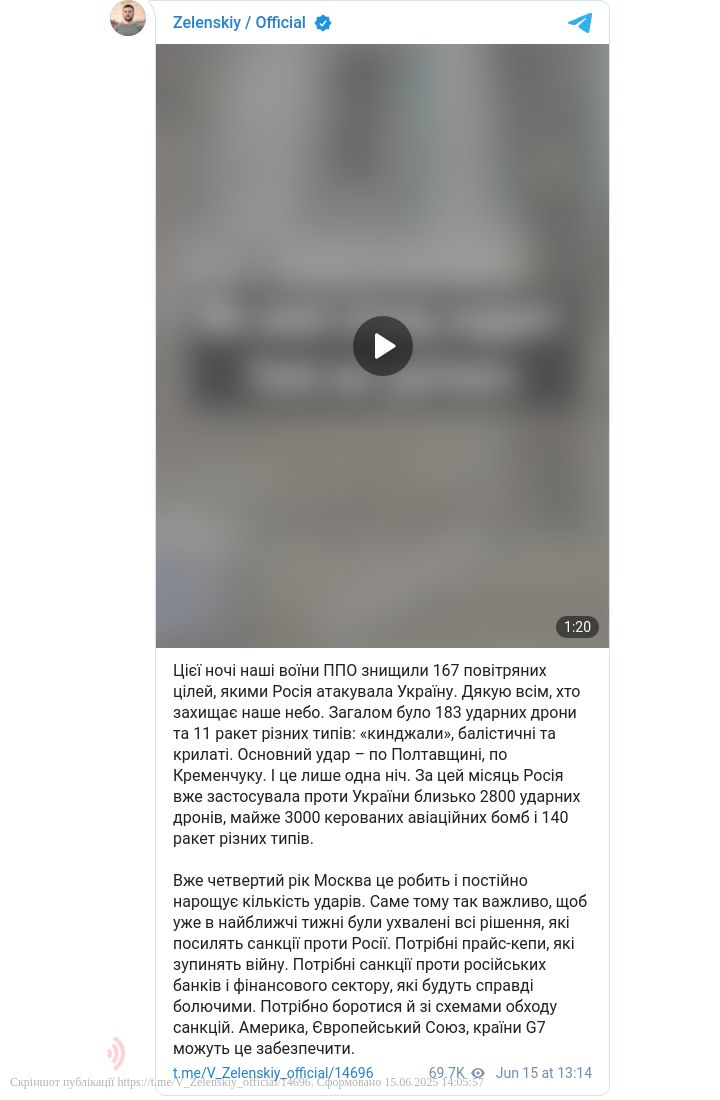 Як зазначив глава держави, цієї ночі воїни ППО знищили 167 повітряних цілей, якими Росія атакувала Україну. Загалом окупанти випустили 183 ударні дрони та 11 ракет різних типів: «Кинджали», балістичні та крилаті.