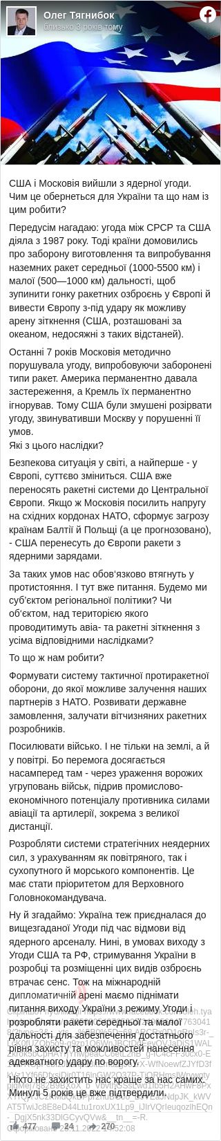 «Передусім нагадаю: угода між СРСР та США діяла з 1987 року. Тоді країни домовились про заборону виготовлення та випробування наземних ракет середньої (1000-5500 км) і малої (500—1000 км) дальності, щоб зупинити гонку ракетних озброєнь у Європі й вивести Європу з-під удару як можливу арену зіткнення (США, розташовані за океаном, недосяжні з таких відстаней).