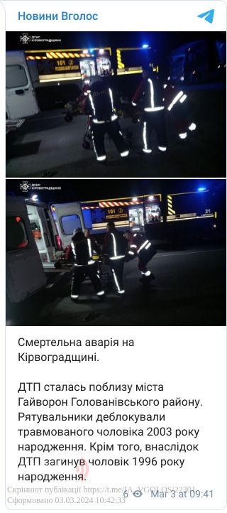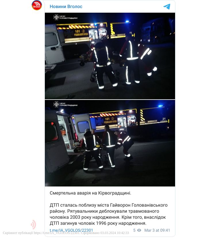2 березня о 22:35 до Служби порятунку “101” надiйшло повiдомлення про дорожньо-транспортну пригоду, яка сталась поблизу міста Гайворон Голованiвського району.