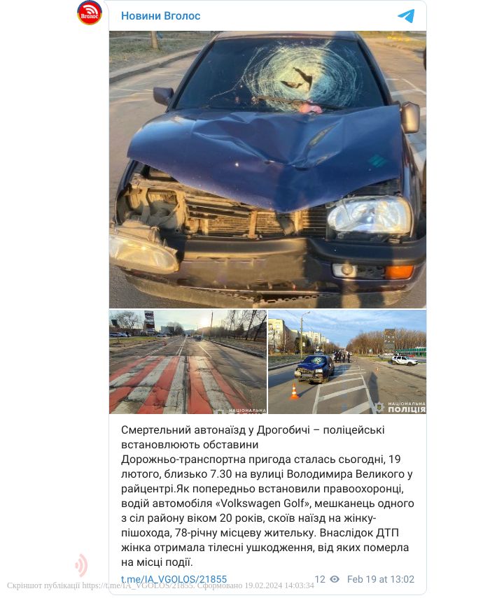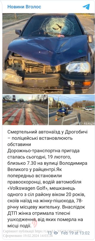 Як попередньо встановили правоохоронці, водій автомобіля «Volkswagen Golf», мешканець одного з сіл району віком 20 років, скоїв наїзд на жінку-пішохода, 78-річну місцеву жительку. Внаслідок ДТП жінка отримала тілесні ушкодження, від яких померла на місці події.