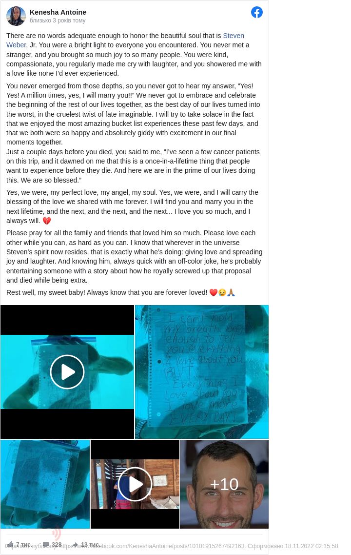 Пані Антуан, яка підтвердила смерть коханого у своєму Facebook, заявила, що "так і не виринула на поверхню з тих глибин".